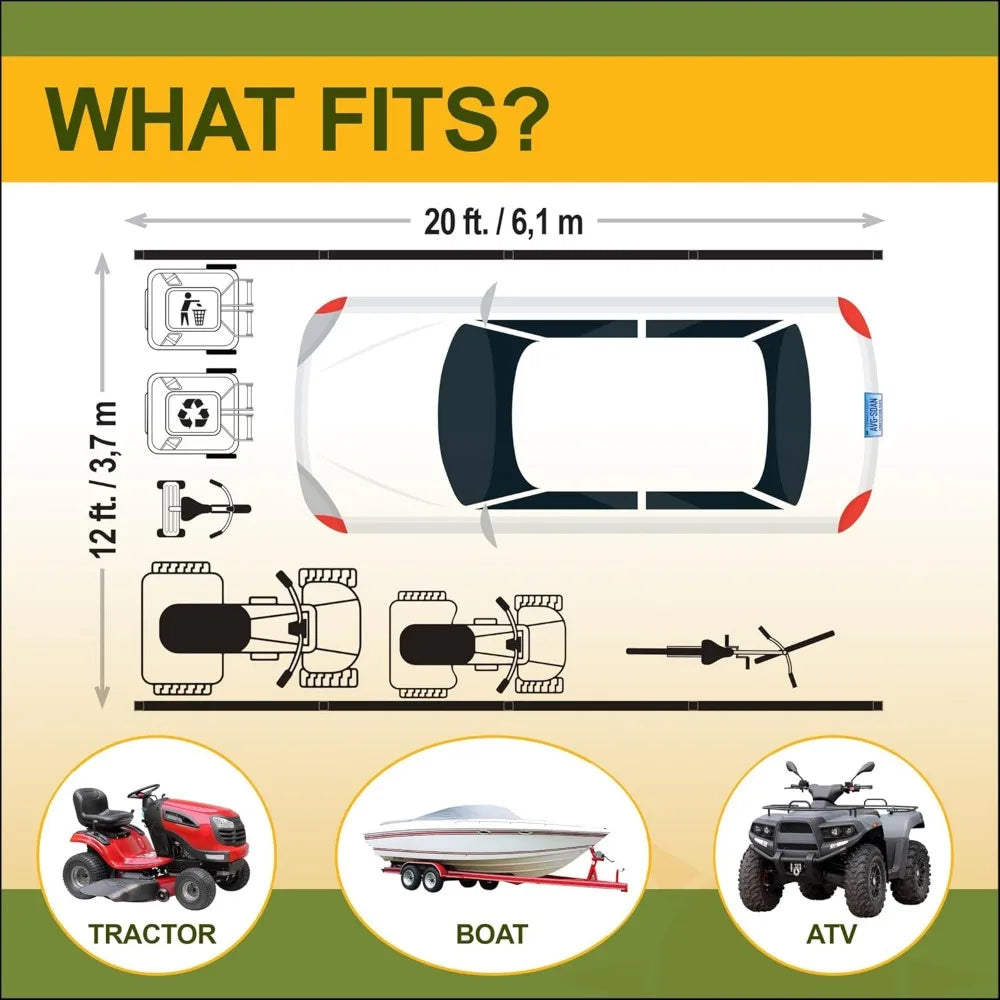 - Spacious, versatile coverage: With 364 sq ft of coverage and 1,792 cu ft of interior space, you can park multiple vehicles or store bikes, tools, and outdoor equipment.