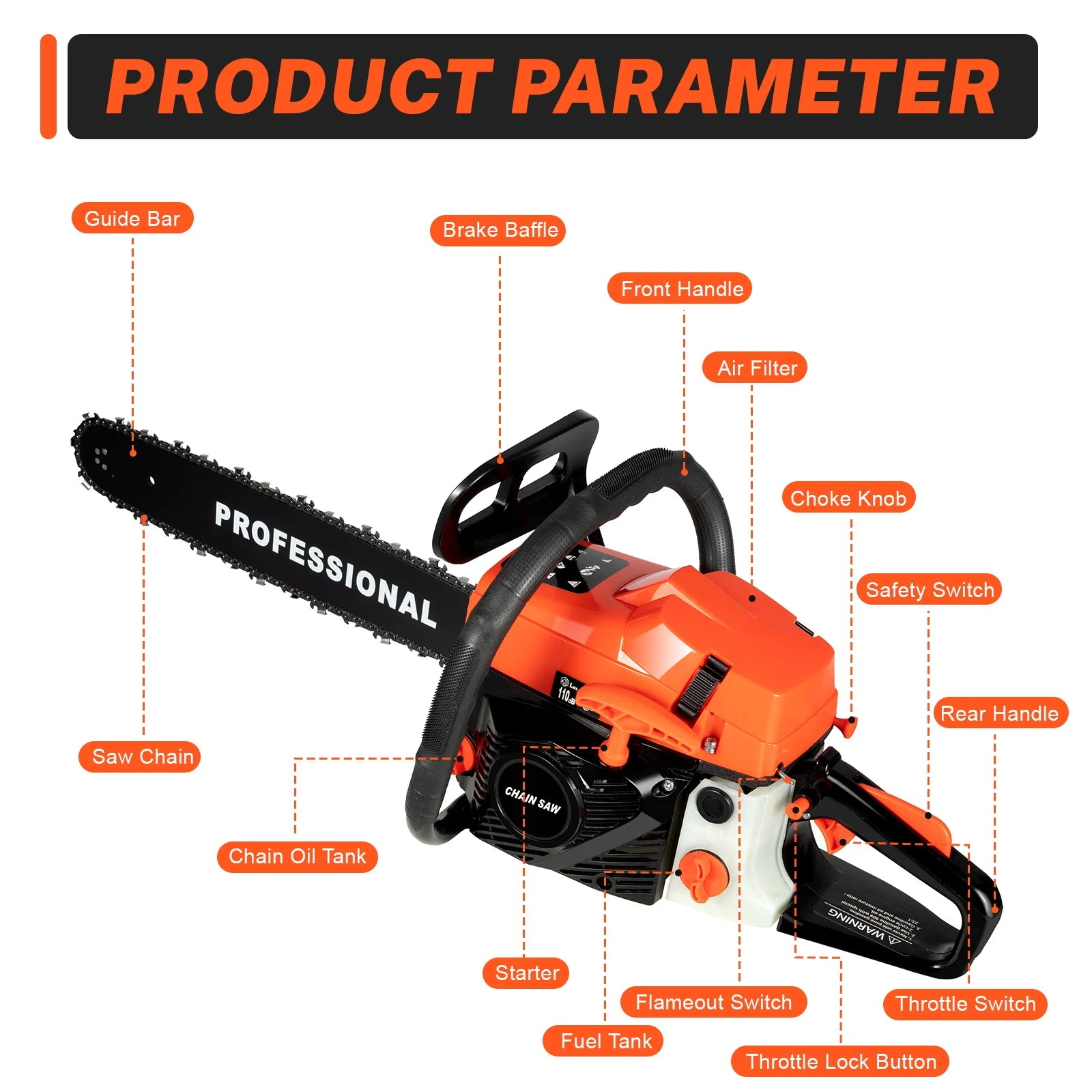 High Safety: It can only be activated by pressing both switches simultaneously, which can prevent accidental touch of the throttle switch. Moreover, the high-quality brake baffle can make emergency braking, protect your hands from hurting, and avoid sawdust splashing. The flameout switch and the throttle lock button also ensure your safety.