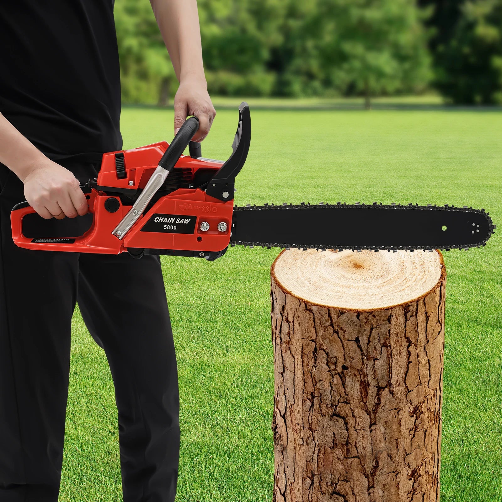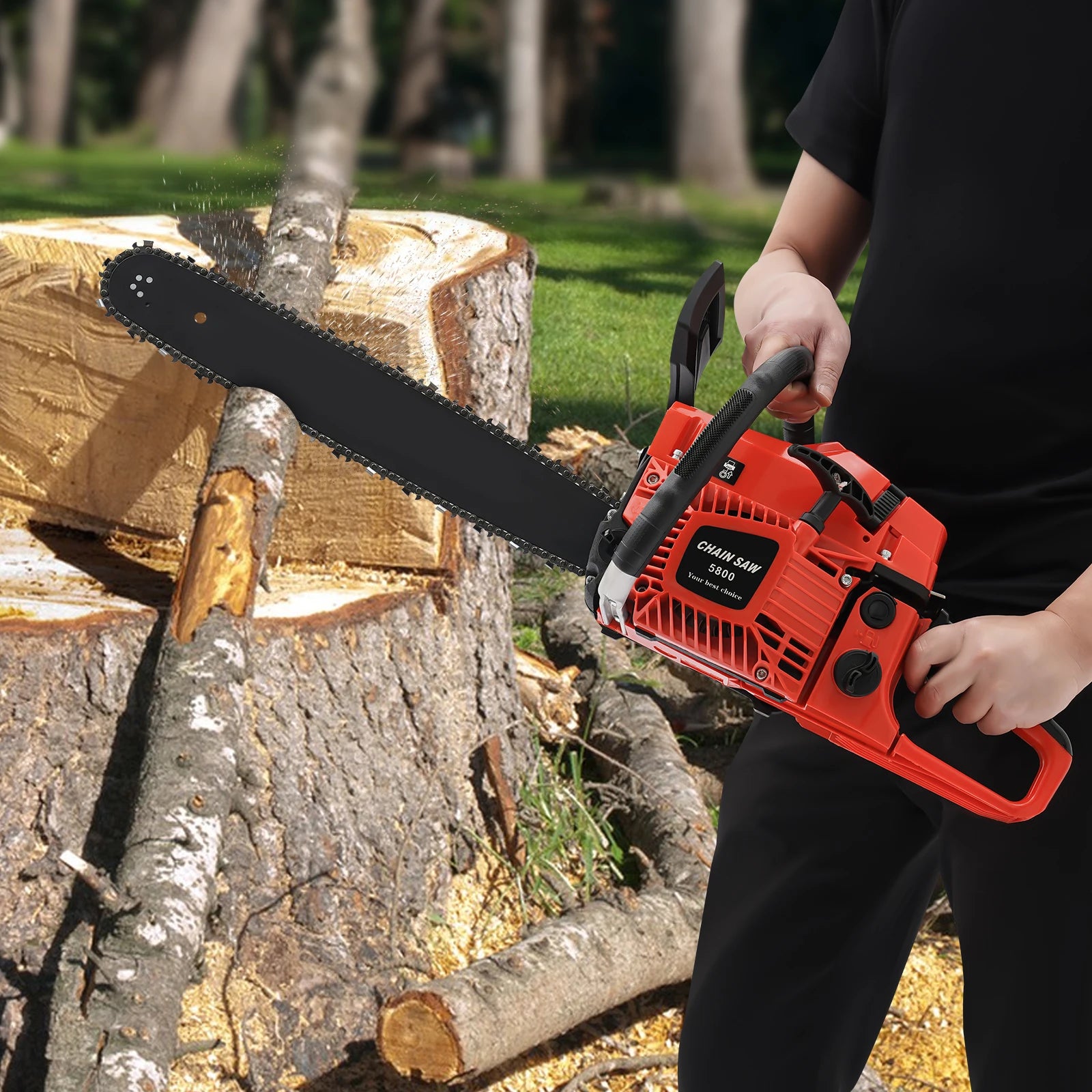 Excellent Performance: The 2-stoke engine with 58cc displacement, 10500rpm high speed, and 2.6KW high power, the 20" guide chain, and the diaphragm carburetor with the function of atomizing fuel help this machine keep normal and economical operation, reduce emissions, achieve fast cutting, thus providing excellent performance and meeting most cutting needs(about 19.69" cutting diameter).