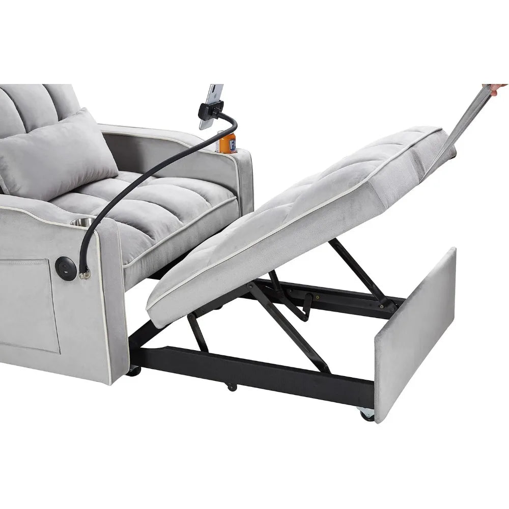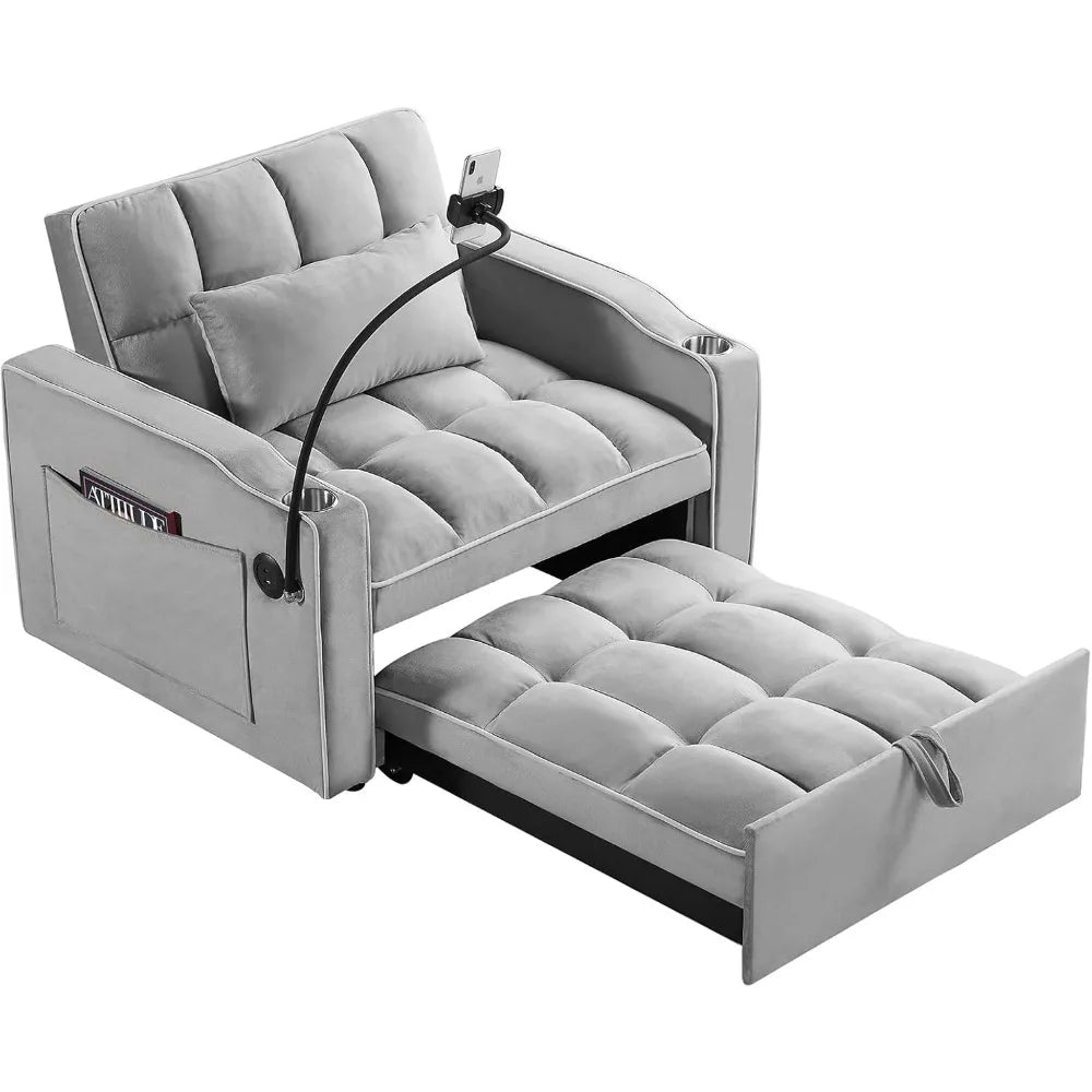 3 in 1 Convertible Sleeper Chair Bed with USB Ports, Cup Holder and Phone Stand, Velvet Pull Out Futon Sofa Beds, Adjustable Bac