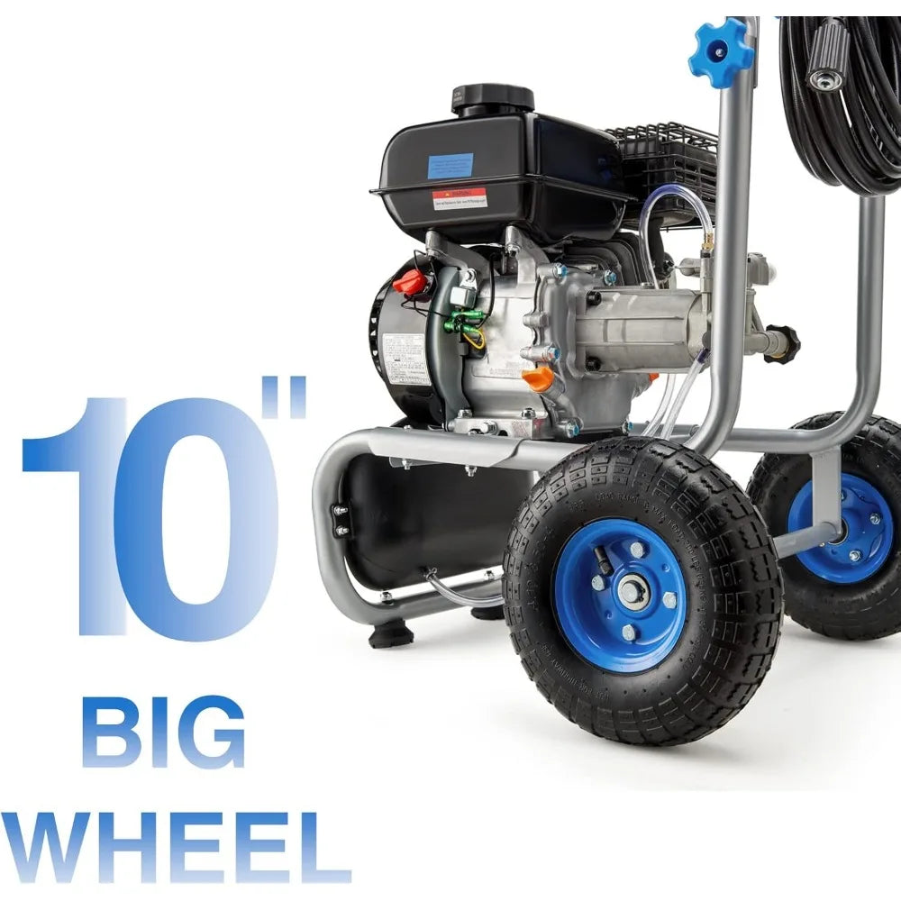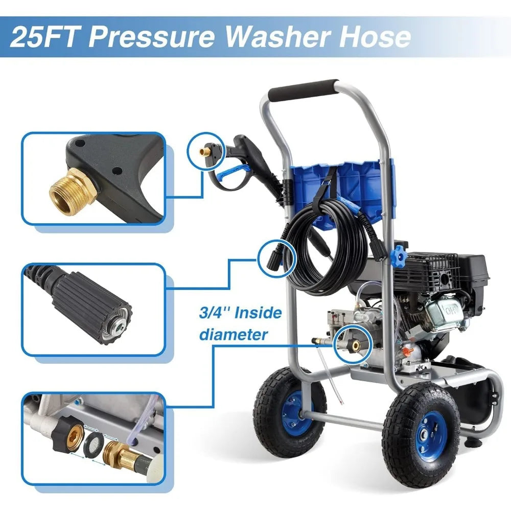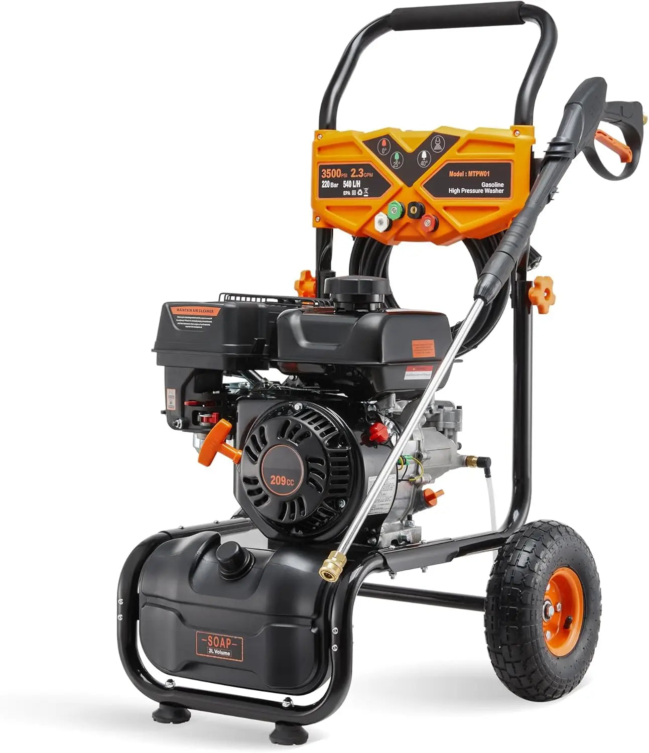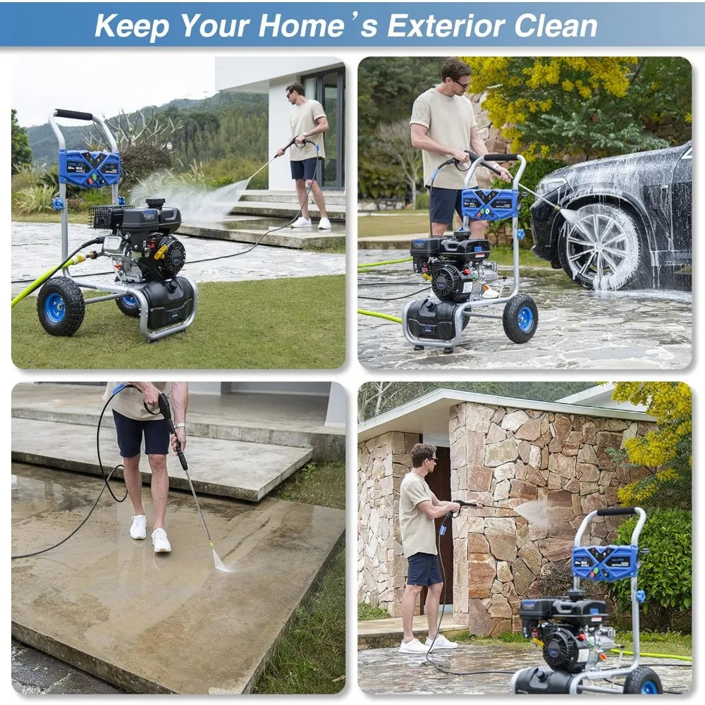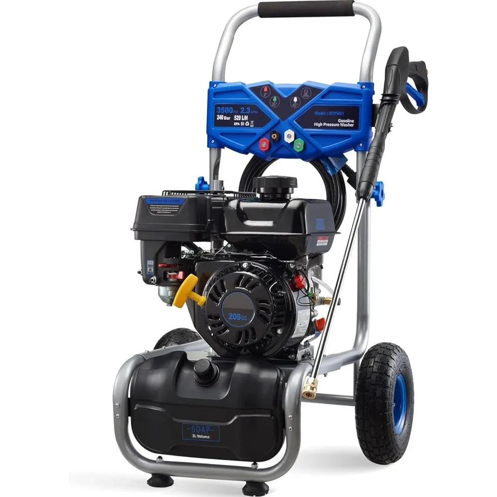 [ , % - ] With 3500 PSI and 2.3 GPM, the gas pressure washer strips away stubborn grime, thick moss, deep-set oil stains, and even old, peeling paint in seconds-stronger than standard 3200 PSI models. Whether you are renewing the exterior of your house, fence and driveway repairs, vehicle equipment cleaning, or tackling post-storm cleanup, get pro-level cleaning at home! - faster, easier, and more efficient than ever! [ - - ] Heavy Duty Gas Power Washer is powered by a 7HP 4-stroke OHV 209CC engine with recoil start, that outperforms standard models. The durable axial cam pump ensures reliable, long-lasting performance with minimal maintenance. [ - - ] Switch 4 quick-connect nozzles (0°, 25°, 40°, and soap) easily, each designed for specific tasks. From high-pressure jets (0°) for deep stains to a gentle 40° spray for delicate surfaces like vehicles-this washer covers every cleaning need with ease, for gutters, sidewalks, decks, patios, outdoor furniture, car/RV, mechanical maintenance, and home remodeling. [ - - , ! ] With a 25FT extended hose, cover more area with less effort-no more dragging the machine around! Effortlessly clean rooftops, driveways, vehicles, and hard-to-reach spots, cutting down cleaning time while boosting efficiency. More reach, less hassle, superior results! [ & - ] Built with a rugged steel frame and corrosion-resistant coating, this high pressure washer is made to last, more durable than another high pressure washer on the market. The 10-inch pneumatic tires roll smoothly over dirt, and grass, making movement effortless. No power outlets needed-clean anywhere, anytime, from remote job sites to outdoor spaces! [ ] Use SAE 10W-30 engine oil and gasoline (87+ octane) for optimal performance; The machine is factory-tested, so a slight fuel odor may be present; Ensure the gasket is in place when connecting the water hose to prevent leaks. [ - ! ] We provide professional assistance and dedicated customer support to ensure a smooth experience. If you have any questions, we're here to help!