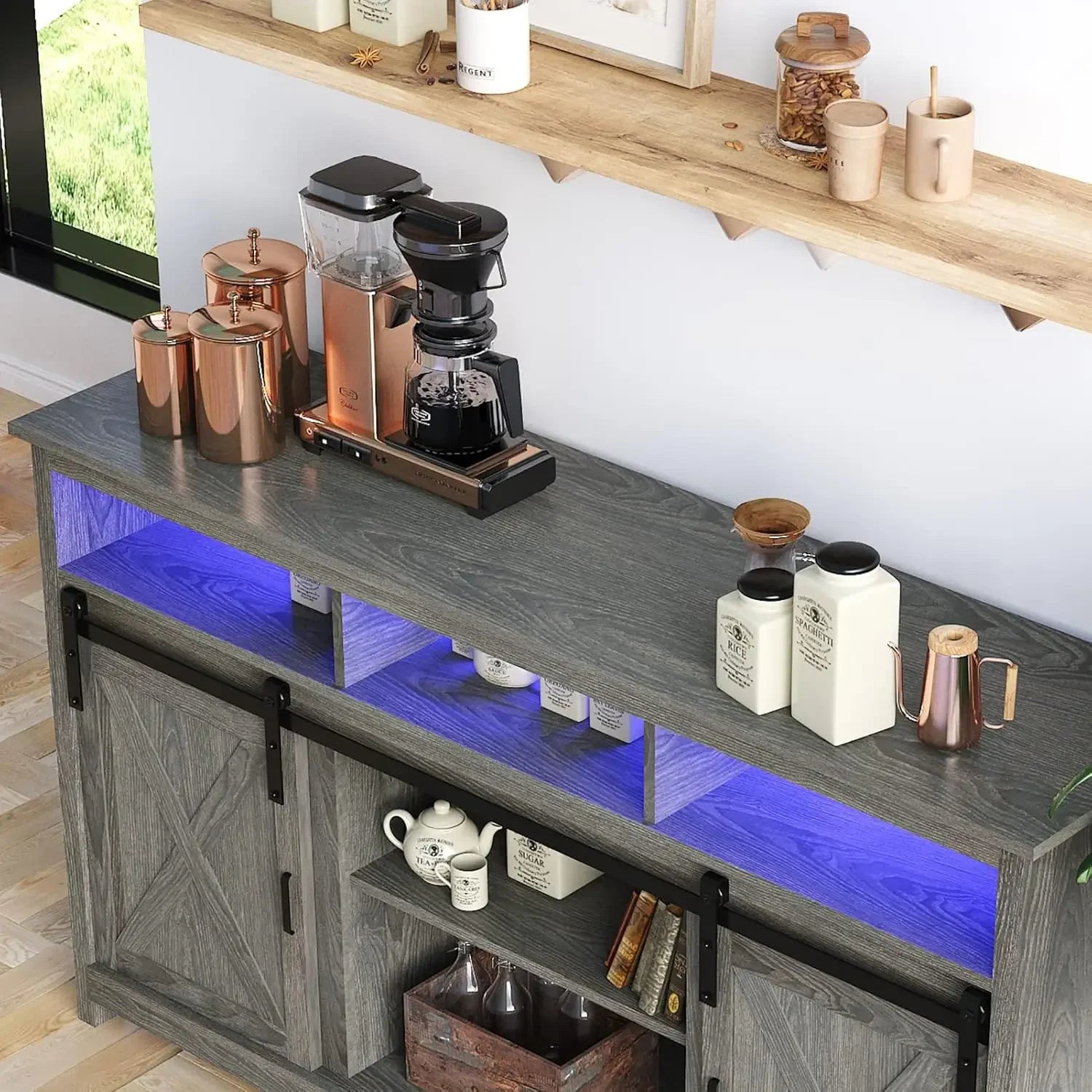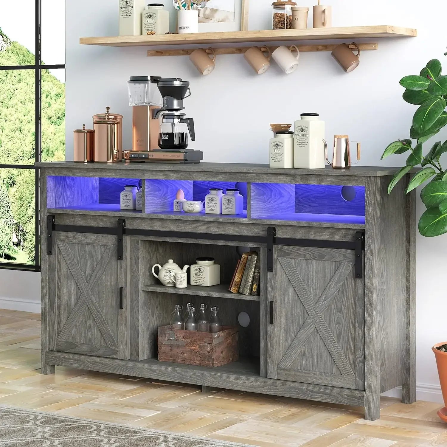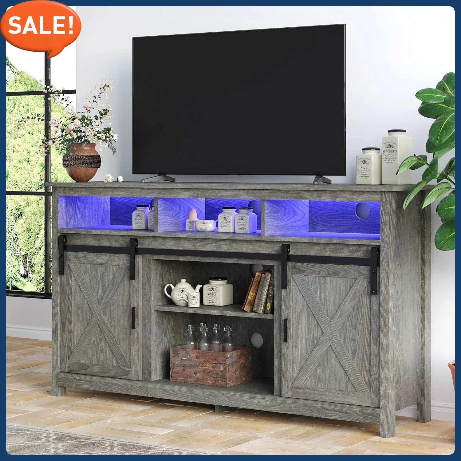 LED Farmhouse TV Stand for 65 inch TVs, Rustic Entertainment Center TV Cabinet Stands with Power Outlets, Wooden Sliding Barn Door TV Media Console Table Storage and Shelves Wash Grey