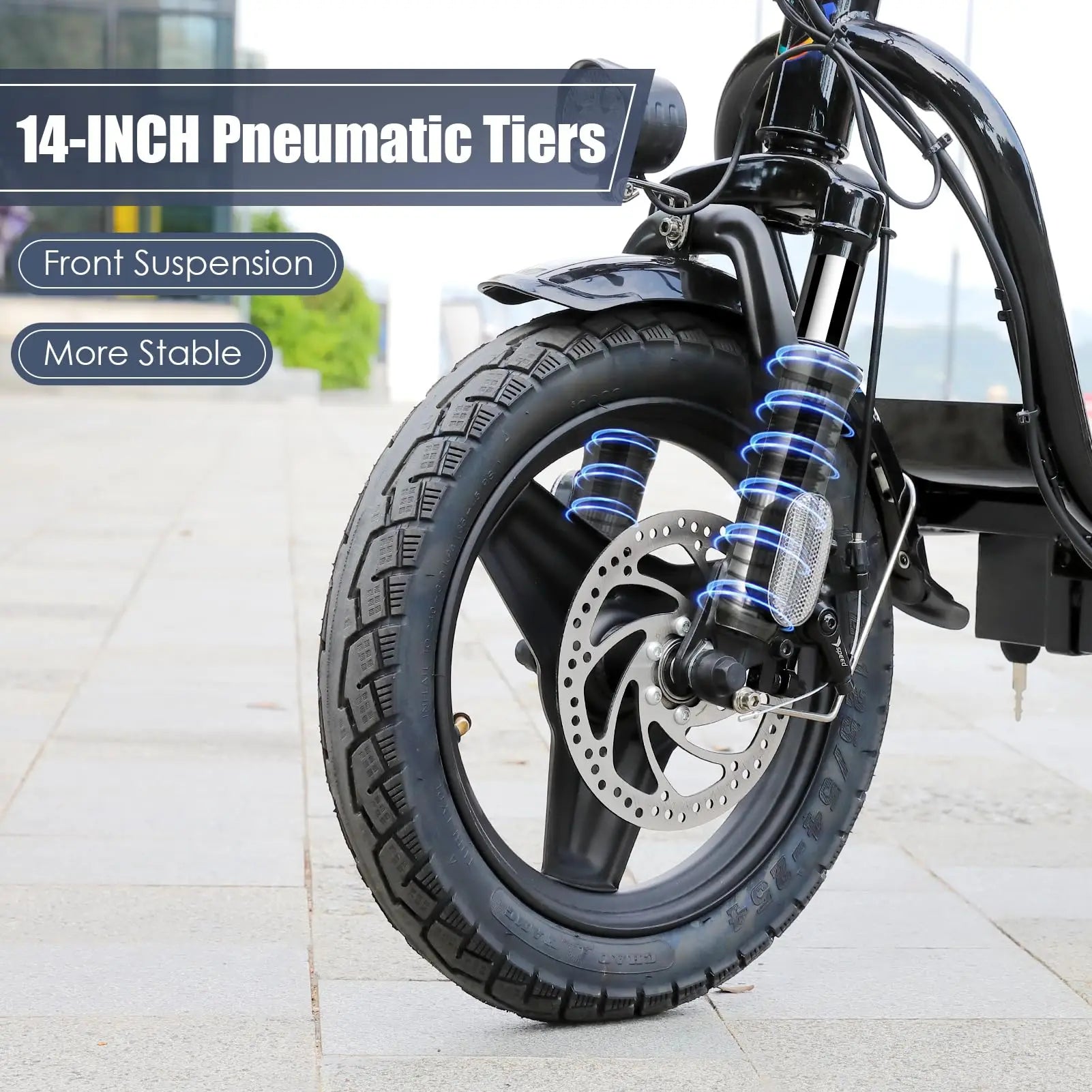 - All-terrain comfort: You ride on 14" fat tires with multi-link suspension to damp shocks and smooth rough roads for daily commutes.