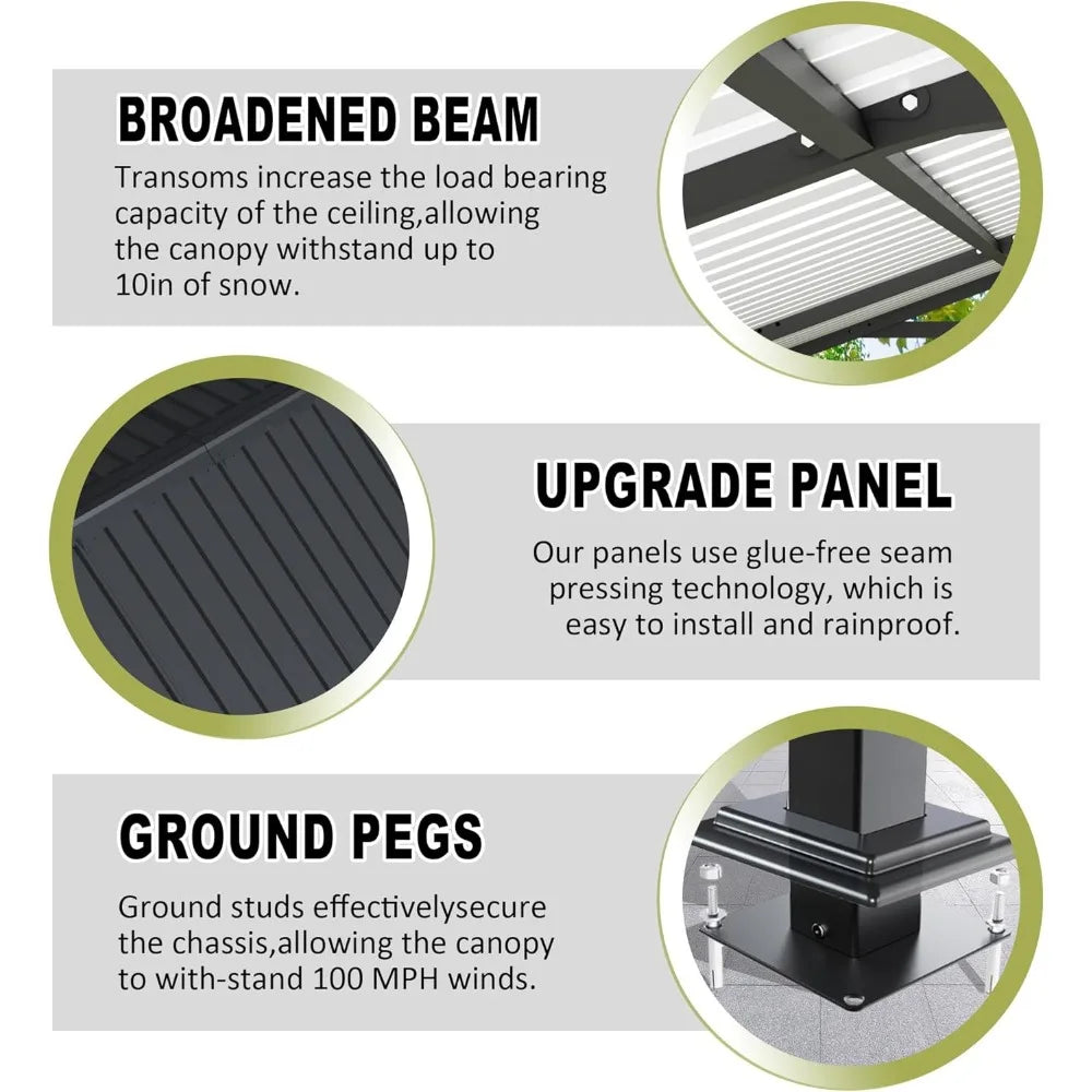 - Rugged, weather-ready frame — A 12'x20' square steel tubing frame reinforced at six corners with a galvanized steel roof, delivering rust resistance and stability in high winds (up to 100 MPH) and heavy snow (35 PSF).