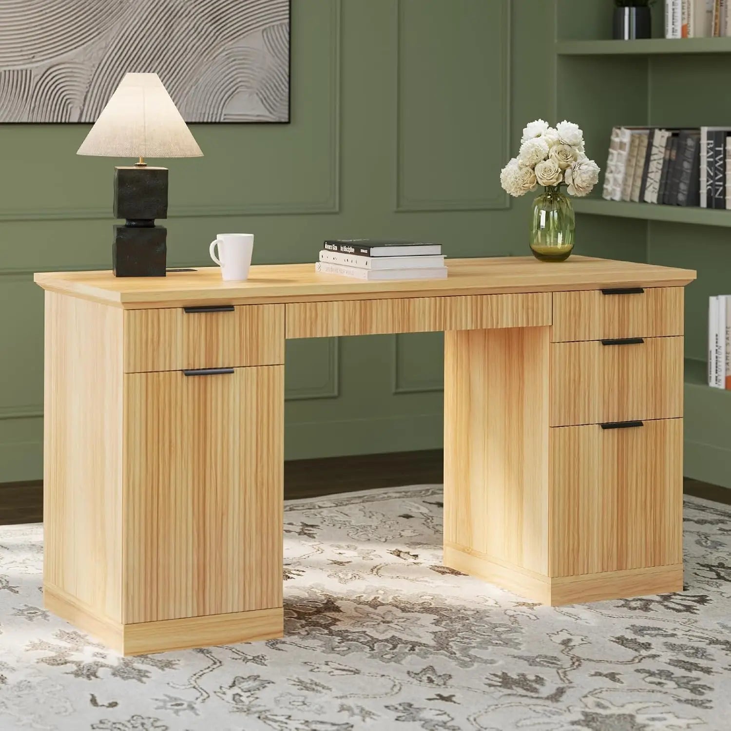 ZHUOTING Fluted Modern Executive Desk With File Cabinet Drawers
