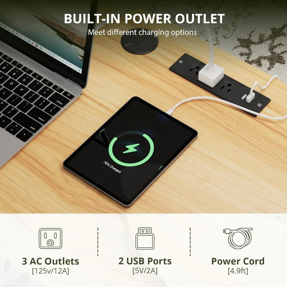 - Stay powered and connected with a built-in charging station featuring 2 USB ports and 3 AC outlets, keeping cords neatly managed.
