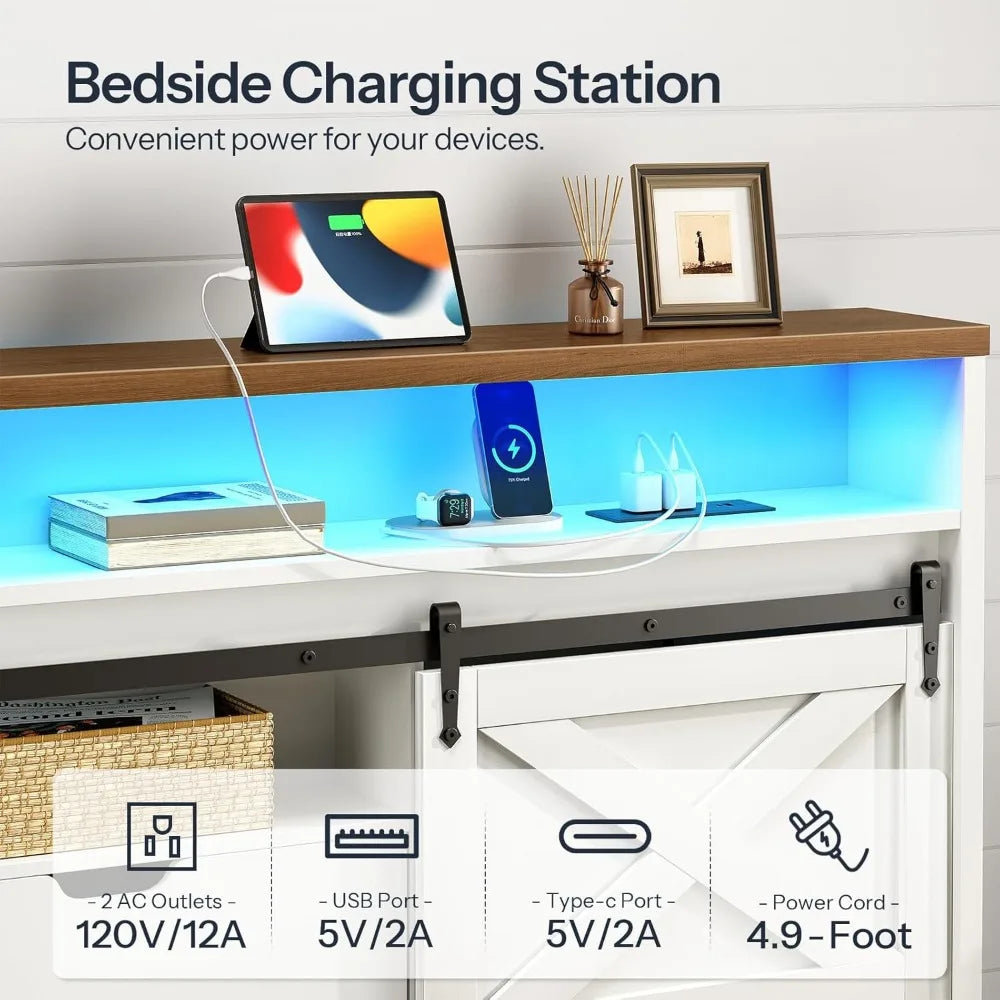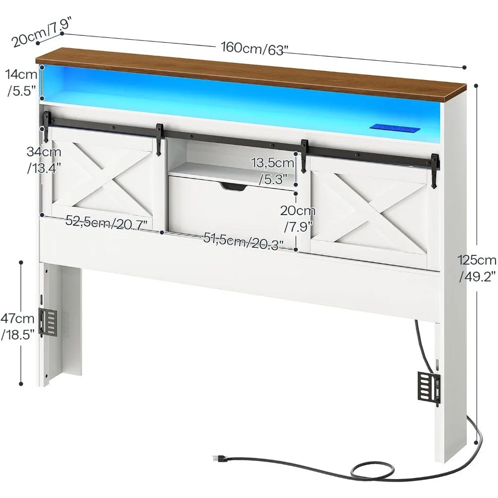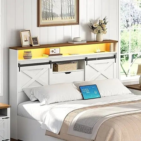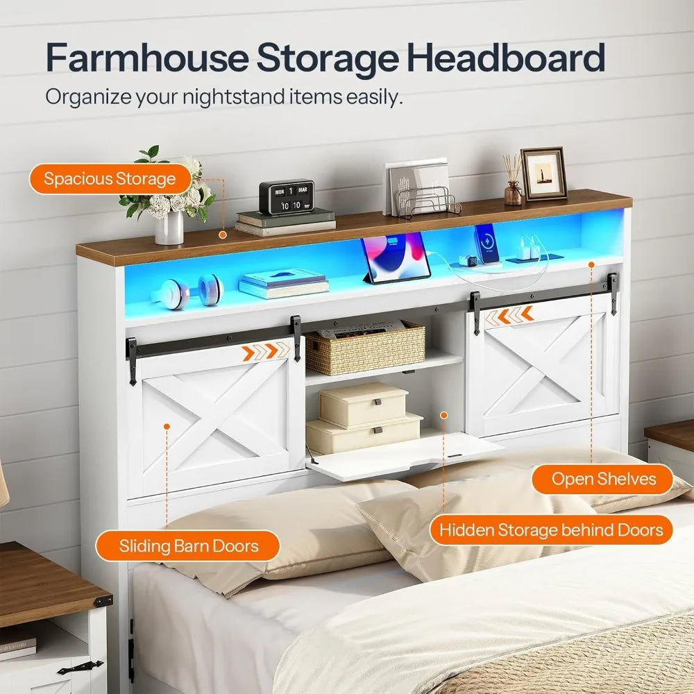 Queen Size Farmhouse Headboard with Storage Shelf Charging Station and LED Lights
