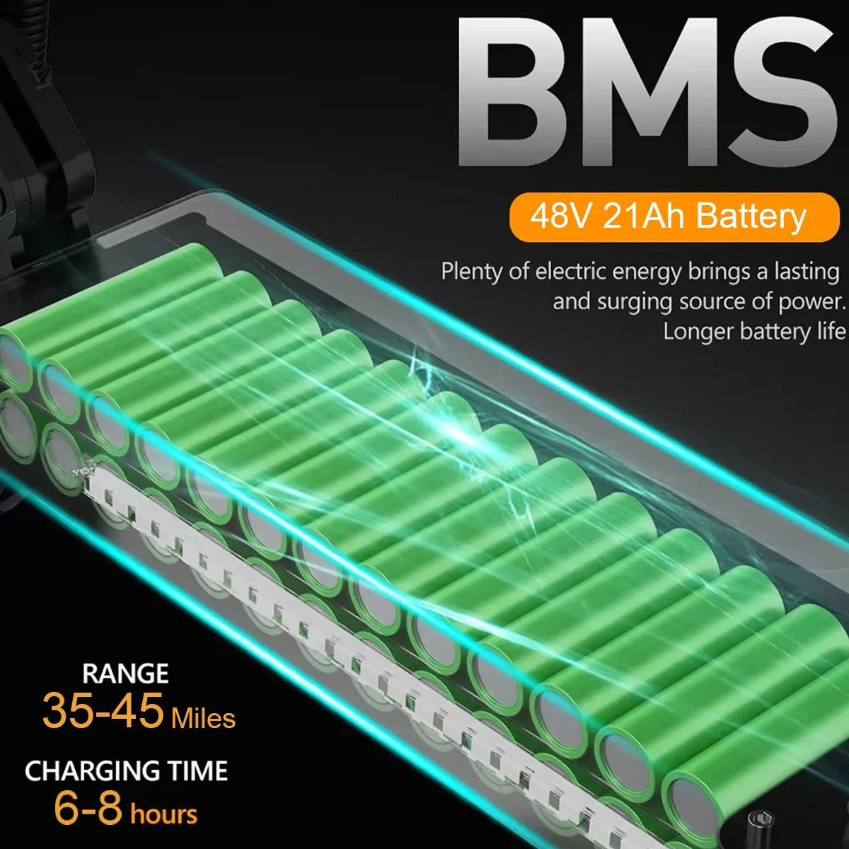 - High-capacity 48V battery: A robust 48V battery supports longer rides between charges, so you spend less time plugged in and more time rolling.