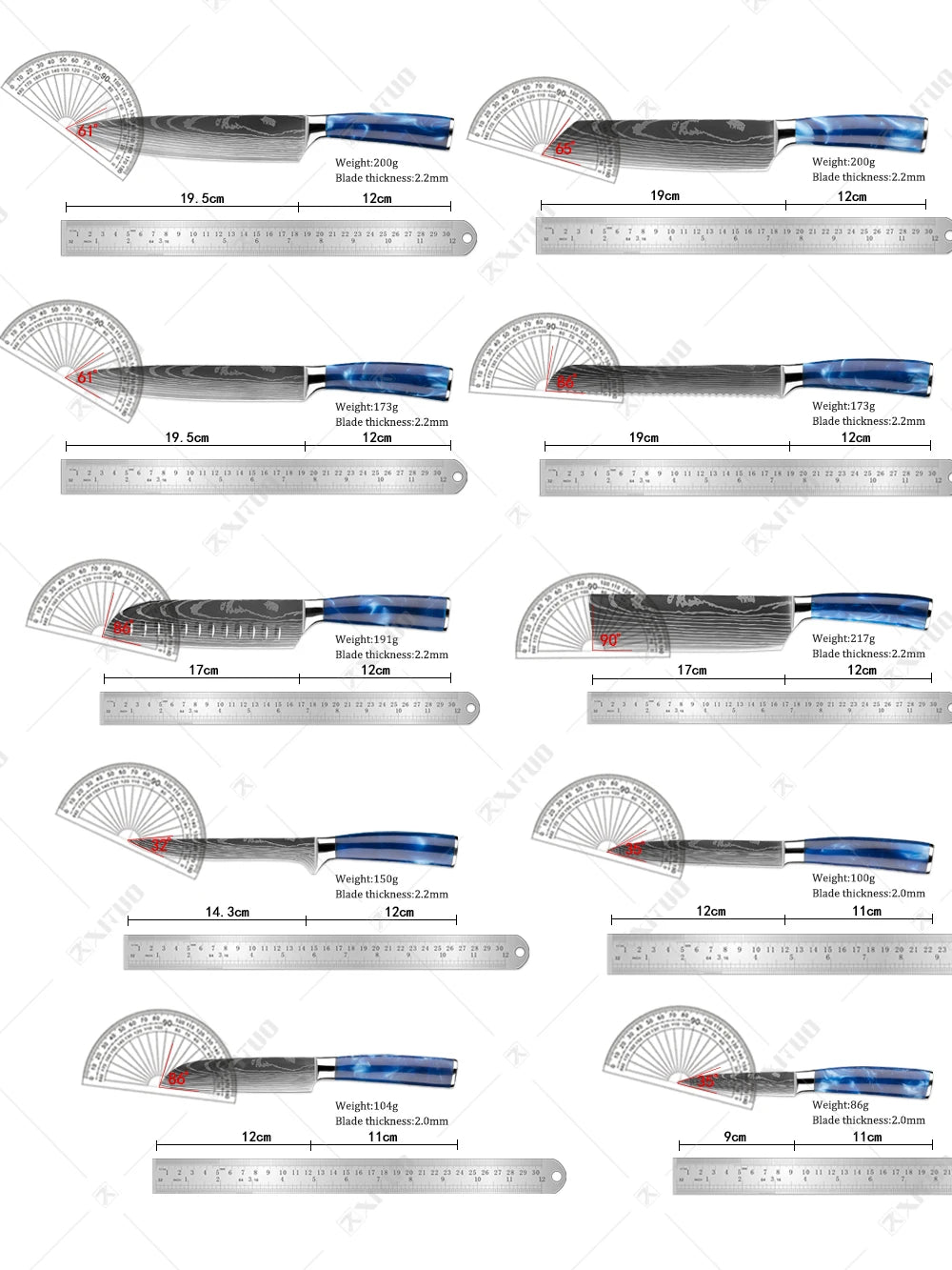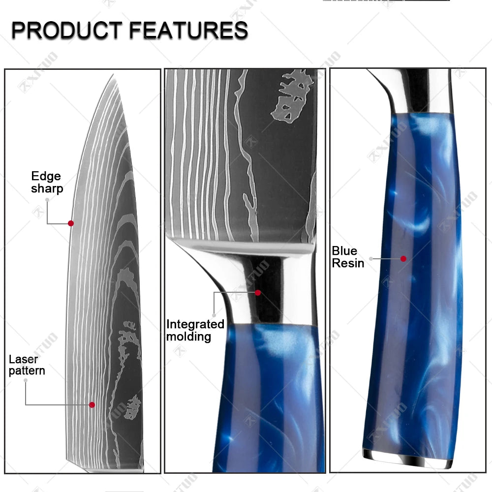 Stainless Steel Kitchen Knife 8PCS Set Blue Resin Handle Sharp Slicer Cleaver knife Damascus Laser Pattern With Knife Holder