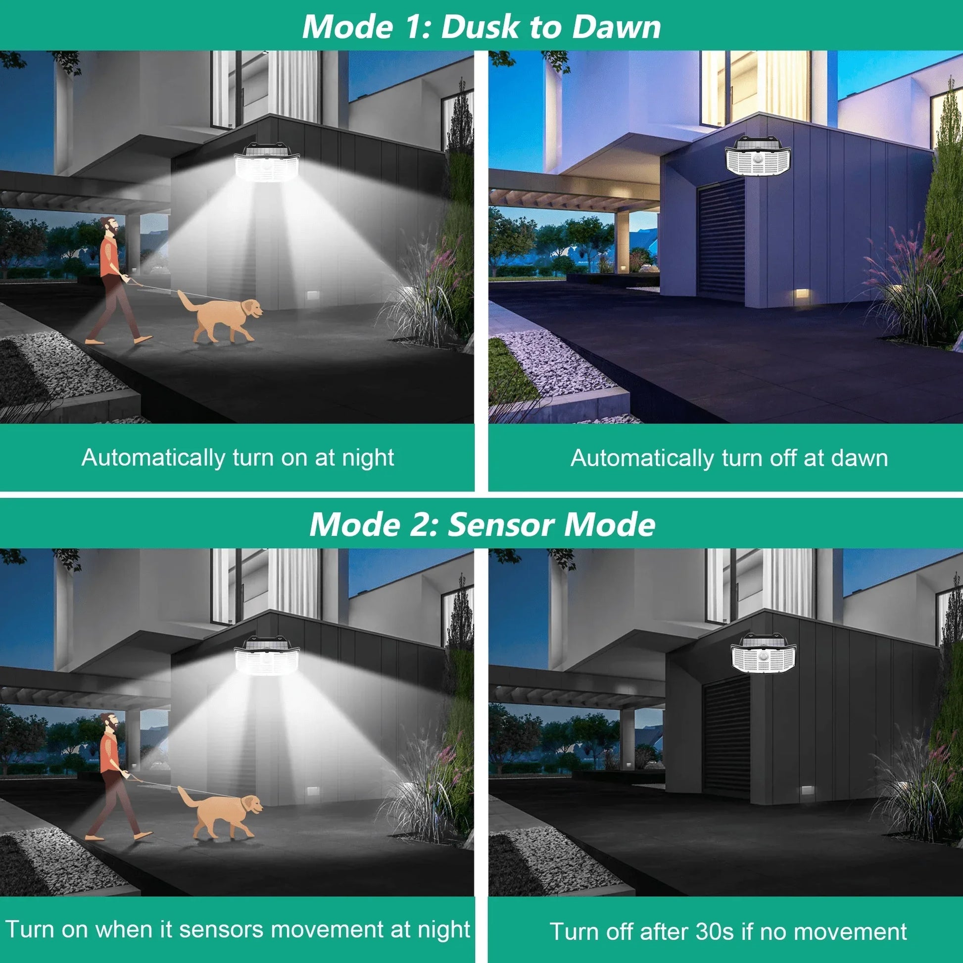 - Two Adjustable Modes: Choose between Security Mode, which activates the lights automatically upon detecting motion, or Permanent On Mode for continuous illumination throughout the night.